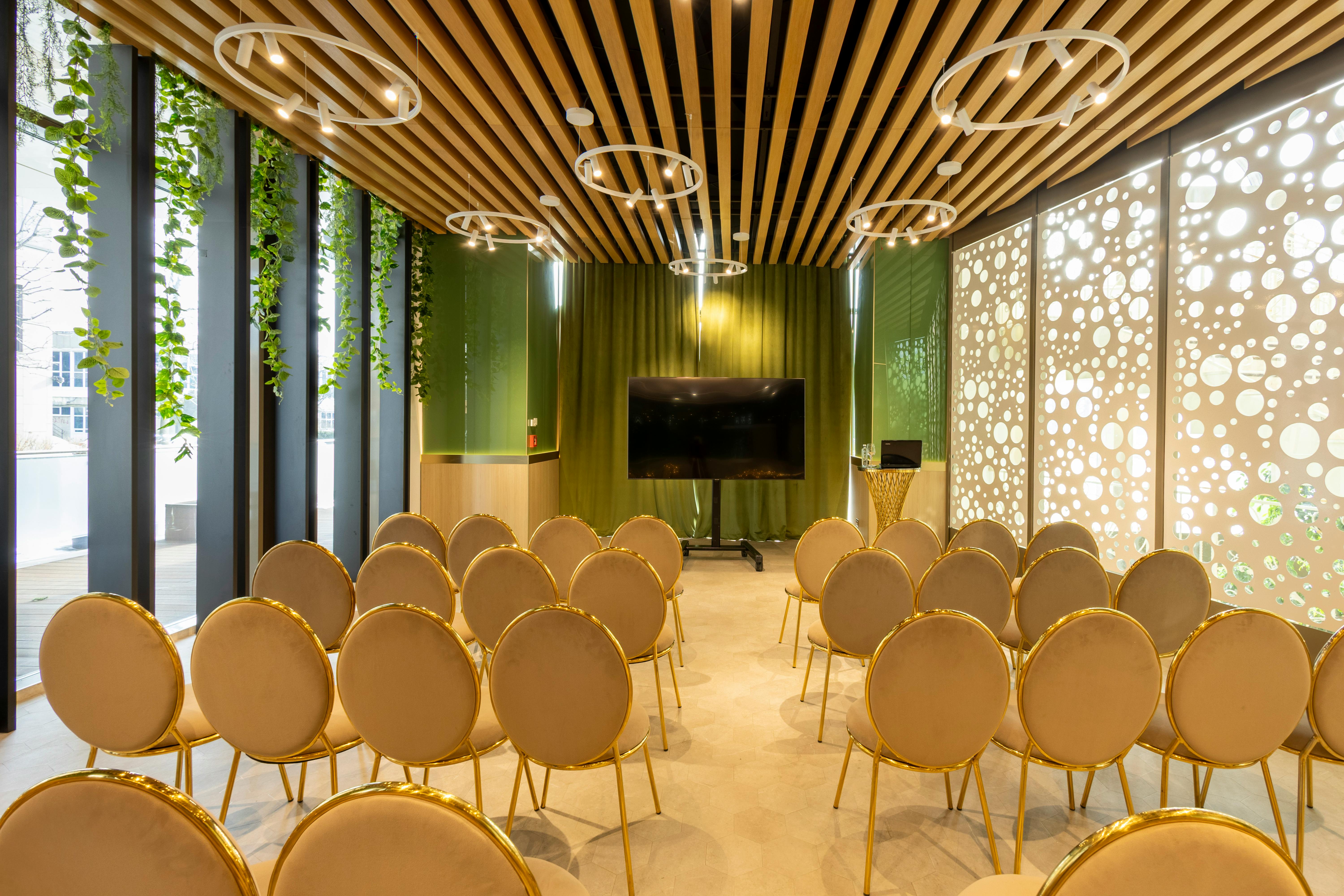 Our largest space, Magnum Hall, boasts 423 sqm of elegant, pillar-free layout with a 4.8m ceiling height, perfect for large-scale conferences and exhibitions. For more intimate gatherings or workshops, smaller rooms such as Belvedere (11th floor) or Exo (ground floor) provide stylish, well-equipped alternatives with natural light and city views.